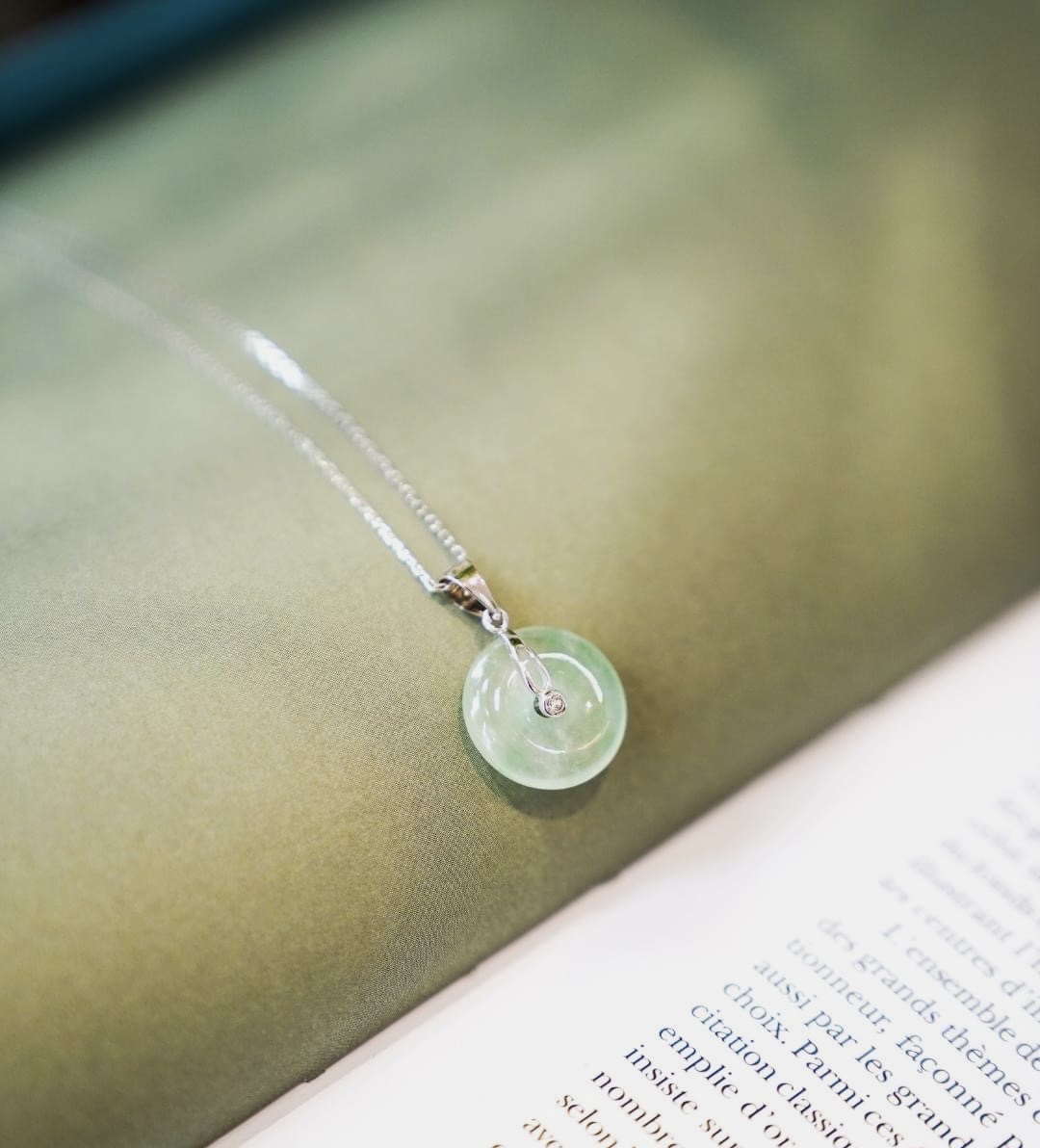 Le luxe discret d’une pierre précieuse unique. Un disque de jade véritable et translucide aux nuances vert, monté sur une fine chaine en argent 925/1000.