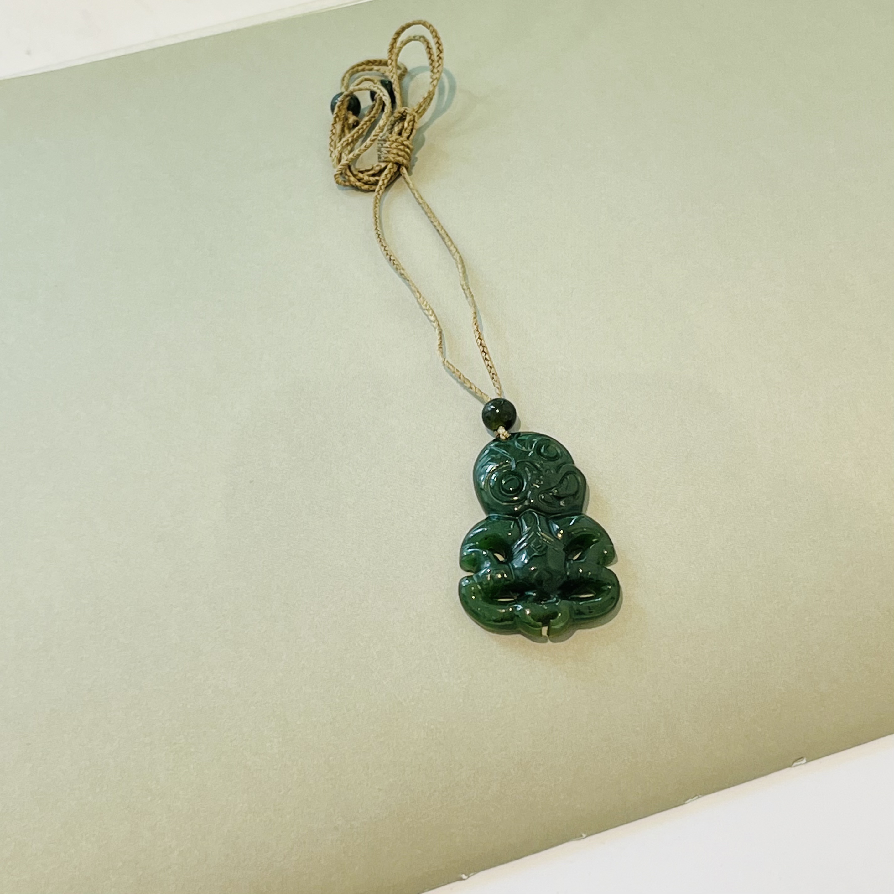 – **Pendentif** : Sculpture en forme de **tiki**, un symbole sacré dans les cultures polynésiennes et maories, représentant souvent des divinités ou des ancêtres protecteurs.