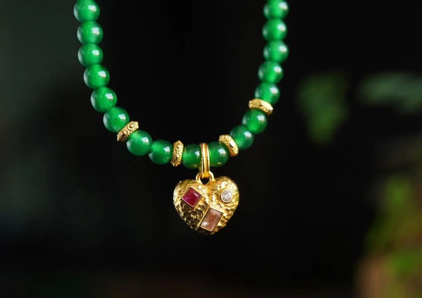 Accompagné d’un petit pendentif en forme de cœur en or 18k orné de rubis et de diamants.
